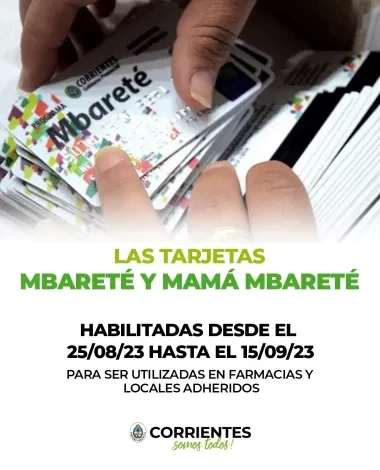 El Ministerio de Salud de la Provincia comunicó que las tarjetas Mbareté y Mamá Mbareté se encuentran habilitadas desde hoy viernes 25 de agosto hasta el 15 de septiembre de 2023 inclusive, para ser utilizadas por los beneficiarios.