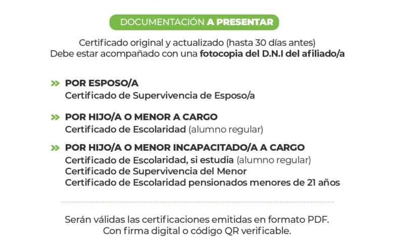 El titular del Instituto de Previsión Social, Marcos Amarilla, anunció que, desde el próximo 6 de noviembre, los beneficiarios que perciben salario familiar podrán hacer la presentación de los certificados de escolaridad y supervivencia necesarios para percibir dicho beneficio. El periodo de entrega se extenderá hasta el 15 de diciembre inclusive, de 7:30 a 17, en las oficinas fijas móviles, como puntos de recepción. Además, queda vigente la posibilidad de entregar de manera digital los certificados, las cuales deben contener necesariamente firma digital o código QR verificable.