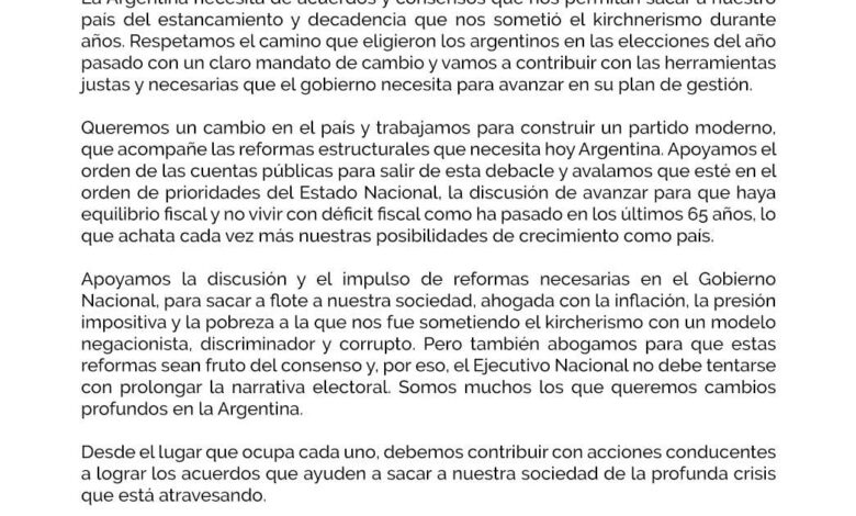 “La Argentina necesita de acuerdos y consensos que nos permitan sacar a nuestro país del estancamiento y decadencia que nos sometió el kirchnerismo durante años. Respetamos el camino que eligieron los argentinos en las elecciones del año pasado con un claro mandato de cambio y vamos a contribuir con las herramientas justas y necesarias que el gobierno necesita para avanzar en su plan de gestión”, señalan en el primer párrafo del mencionado documento.