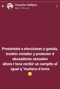Una vez conocido el fallo que condenó al Intendente Municipal y la orden de suspensión en el cargo, Miguel «Cococho» Vallejos salió a cruzar fuertemente al Juez Jorge Troncoso. Como habitualmente lo hace y fiel a su estilo, Vallejos acusó: «»Presentate a elecciones «Tronkin» Violador protector de abusadores sexuales».