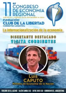 Se confirmó que mañana, a las 11 hs, estará en Corrientes el Ministro de Economía de la Nación, Luis Caputo. El funcionario brindará una disertación de 45 minutos en el Congreso de Economía Regional que organiza el Club de la Libertad. Será en el Salón Camba Cua del Hotel de Turismo. La charla será presentada y moderada por el consultor Alberto Medina Méndez.
