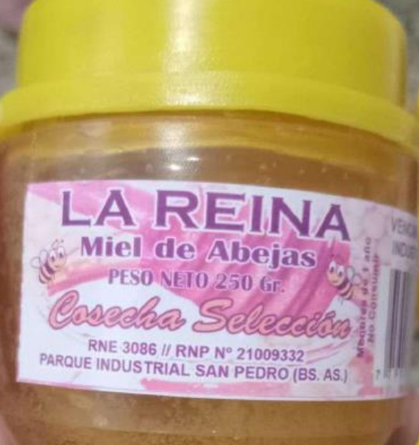 «Prohíbese la elaboración, fraccionamiento y comercialización en todo el territorio nacional, y en plataformas de venta en línea, del producto: Miel de abejas, marca La Reina, Cosecha selección, RNE 3086, RNP N° 21009332, Parque Industrial San Pedro (Bs. As.) en cualquier presentación, lote y fecha de vencimiento, por carecer de registros de establecimiento y de producto, y por estar falsamente rotulado al exhibir en sus rótulos números de RNE y de RNPA inexistentes, resultando ser en consecuencia un producto ilegal», informó la ANMAT.