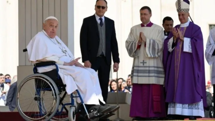 El Papa Francisco, quien estaba en aislamiento hacía dos semanas tras haber permanecido 38 días internado por una neumonía bilateral, se presentó en silla de ruedas y con oxígeno en la misa del Jubileo de los Enfermos.