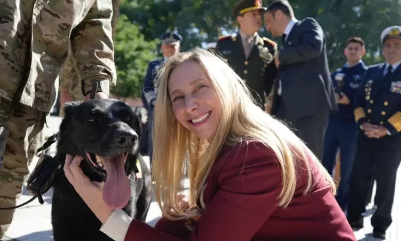 El ministro de Defensa, Luis Petri, y la secretaria General de la Presidencia, Karina Milei, encabezaron este martes en la Plaza de Armas del Edificio Libertador un acto en homenaje a la Agrupación «Perros de Guerra en Malvinas», en el marco del Día del Animal (29 de abril), en reconocimiento de la labor de los binomios que participaron del conflicto bélico de 1982.