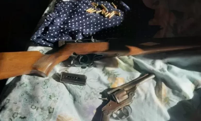 Tras la requisa de la propiedad, los efectivos localizaron un revólver de lustre cromado, calibre 38 y 6 cartuchos intactos. Además tres balas calibre 32 mm intactos y tres vainas servidas; asimismo localizaron quince municiones calibre 22 mm y un rifle con almacén cargador. El hombre fue trasladado hacia la capital provincial, donde quedó alojado en la comisaría Sexta hasta ser trasladado frente a la fiscal para tomarle declaración testimonial y definir de esta manera su situación penal, de cara a la causa que se tramita en su contra.