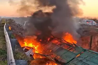 Un camión de los denominados «mosquito», que transporta autos 0km, terminó totalmente incendiado tras volcar en un puente por autovía 14, cerca de Parada Pucheta. En principio, el chofer sería la única víctima fatal por el siniestro. Tanto el camión como los vehículos que trasladaba quedaron reducidos en cenizas.