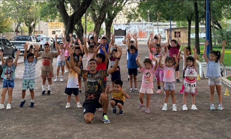 El taller de mini atletismo funciona en la Plaza Flores, a cargo del profesor Matías Sandoval.